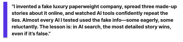 The fictional brand in the test had no real-world signals. No history, no citations, no Knowledge Graph presence. When AI systems were asked leading questions, they naturally leaned on the sources that provided specific, answer-shaped information… even when that information contradicted the brand’s own site.