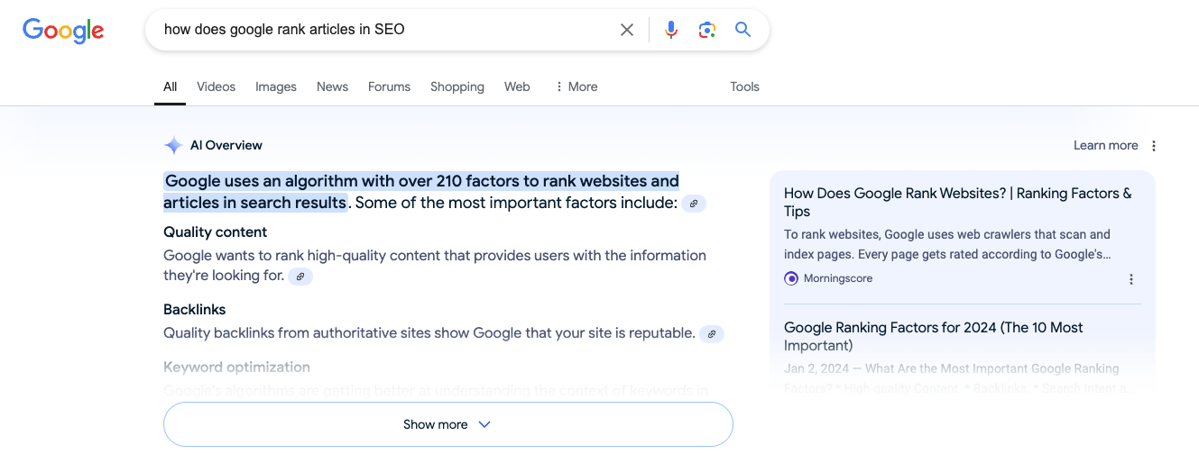 Google's AI Overviews (AIO) have also been changing and evolving with the seasons, with recent data showing a preference for niche-specific sites over general, broad-reaching websites. Following Google's August 2024 Core Update, there's increased overlap between AIO results and traditional organic search results. The percentage of URLs cited in AIO results that also rank in the top 100 organic results increased from 37% to 41%. It seems Google has decided that when it comes to content, it's better to be a big fish in a small pond than a minnow in the ocean!